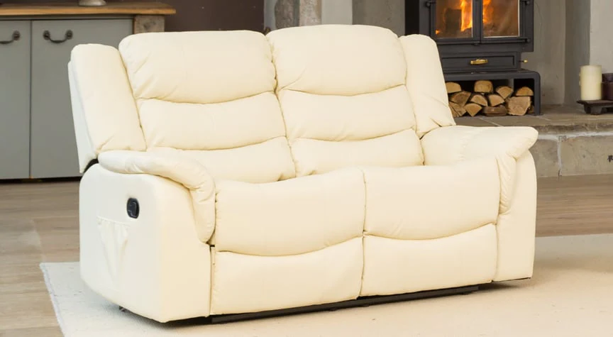 The upper parts of the sofa and the recliner are made of bonded leather, which is both durable and supple. The sides and back are PU. so the sofa combines a great finish with a high degree of practicality. The armchair and both seats of the 2 seater sofa recline, on the 3 seater sofa the left and right hand seats recline. There are two set recline positions, although the recliner can also be used in variable positions between them.